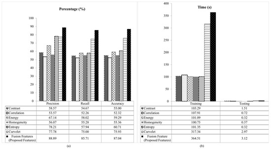 A graphical comparison performance between the proposed fusion features with contrast, correlation, energy, homogeneity, entropy and Curvelet using SVM classifier on NDDA dataset are presented in Figure 8. Based on the Figure 8a, the proposed fusion features is shown to be able to obtain the highest percentage for all measurement of precision, recall and accuracy compared to other features with a minimum value of 85.71% on recall. However, it requires the longest time for the training and testing as shown in Figure 8b. This is due to the reason that the fusion features incorporate three major methods which is the Curvelet, Wavelet and the GLCM method. In addition, the normalization step is skipped in the feature extraction phase to retain the information of a low-quality region on the apple skin images. This will increase the time complexity and reduce the speed. Although the fusion features show high computational time, from these results it can be seen that the fusion features of Curvelet features with five GLCMs features calculated based on the Wavelet coefficient outperformed others in term of the precision, recall and accuracy.