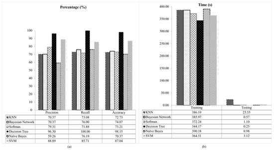 Comparative results of fusion feature for different classifier on NDDA dataset (a) precision, recall and accuracy, (b) training and testing time.