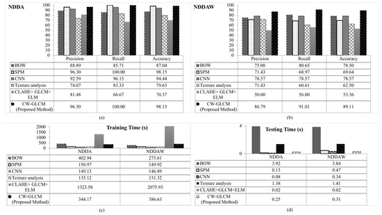 Comparative results of the proposed fusion features using SVM classifier on NDDA dataset (a) precision, recall and accuracy, (b) training and testing time.