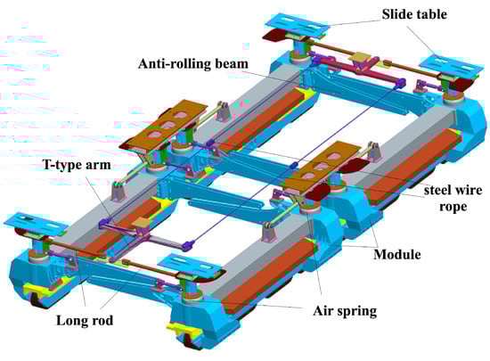 The running mechanism of the Maglev train mainly includes a suspension frame, a secondary suspension system (secondary system), an auxiliary steering mechanism and so on, as shown in Figure 1. Therefore, its kinematics modeling can be divided into two levels: the kinematics of the suspension frame and secondary kinematics. In the kinematics of the suspension frame, the left and right modules of the suspension frame are constrained by the track, so the kinematics mainly analyzes the movement of the anti-rolling beams and hanger rods inside the same suspension frame. The suspension frame in the mid-low speed Maglev train is mainly analyzed in this paper, and the analysis of the secondary system is similar to it.