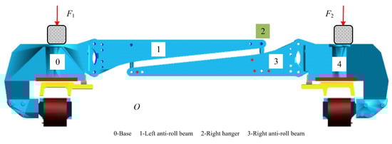 - There is a rotational degree of freedom along the z-direction between base 0 and anti-roll beam 1, whose twist coordinate is . This degree of freedom can decouple the motion of the left and right modules of the suspension frame in the running direction.
