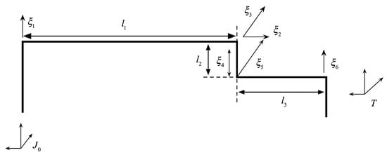 According to the definition of spiral coordinates, . There is for rotary joints, where is the unit rotation axis and is any point on the rotation axis. For translational joints, , and is the unit translation axis. According to Figure 3, the quantities are listed as: , , , , , , , , , , , . Then, the speed spiral coordinates of each link can be calculated. Let the rotation angle or translation distance of each joint be , and the corresponding exponential mapping can be calculated from the exponential mapping of the spiral coordinates: