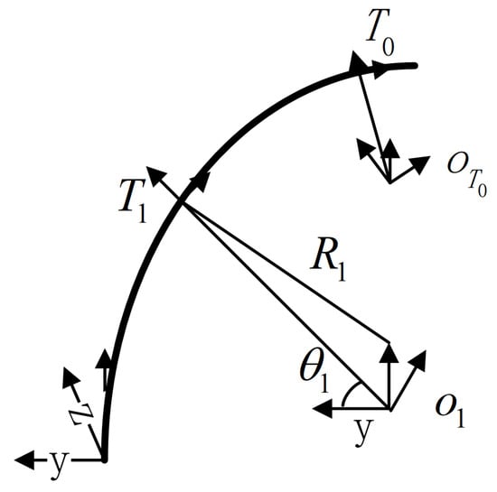 In order to get the posture matrix of the orbital coordinate system , the posture matrix of relative to is calculated firstly. The auxiliary coordinate systems and respectively corresponding to and are established. The origin of is located on the y-negative half axis of the , and the projection distance from the origin of is equal to the curvature radius at . The x-axis of is parallel to the x-axis of , and the z-axis is parallel to the z-axis of . In addition, the angle between the y-axis of and the y-axis is the transverse slope angle . The definition of the coordinate system is similar to that of . The coordinate systems are shown in Figure 4.