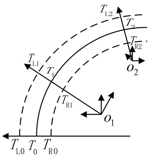 The rail surface formed by the transition curve is complex, and the center line is a kind of plane curve. In order to accurately describe the spatial posture of the transition curve, the coordinate system is defined as follows:The reference coordinate system O is located at the starting point of the center line of the transition curve. A moving coordinate system is set up on the track center line, which can move along the track center line. The other is the track reference coordinate system , which corresponds to the vehicle’s central coordinate system and has a relatively fixed position. The orbital mileage of their origins is respectively and .