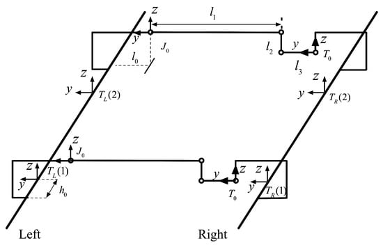 The reference coordinate systems and of the kinematics equation of the suspension frame are set at the first joint of the anti-rolling beam group (the connection between the left module and the anti-rolling beam) and the last joint (the connection between the right module and the anti-rolling beam). They do not coincide with the track coordinate system and . Therefore, it is necessary to design the transformation matrix so as to transform the train–track constraint relation to the reference system of the inverse kinematics solution.