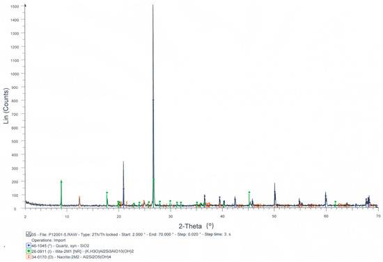 Mineralogical analysis results are shown in Figure 1, in which it is clear the abundance of quartz, with the presence of clay components as illite and nacrite. This sample has been used in previous research work and further information about it can be found in Menendez-Aguado et al. [19].