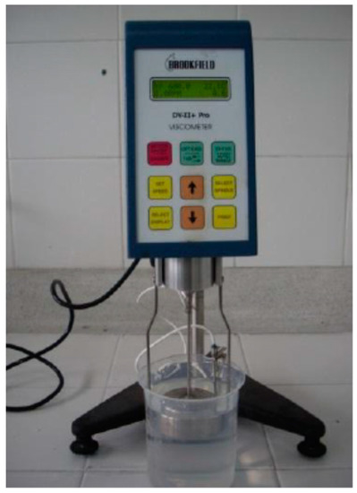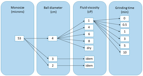 In order to determine breakage parameters, more specifically the specific breakage rate, a series of grinding tests were carried out at each fluid viscosity (including dry grinding test) and at each grinding time (0.5, 1, 3, 5, and 10 min) in laboratory a jar mill (Figure 2). Each test was repeated for each ball size diameter. A block diagram depicting the grinding tests performed for each monosize is shown in Figure 3. The grinding parameters that were fixed during the tests are shown in Table 3. Grinding tests were performed in a laboratory ball mill (0.16 m in diameter and 0.18 m long), with grinding charge made of manganese steel alloy balls, with diameters 2, 3, and 4 cm. To carry out the viscosity measurements, a Brookfield RVDV-2 +Pro device was used (Figure 4), with a shear rate of 66.93 s−1. This value was experimentally determined considering a fixed rotational speed of 100 rpm, and according to the Brookfield recommendations for the selected configuration.