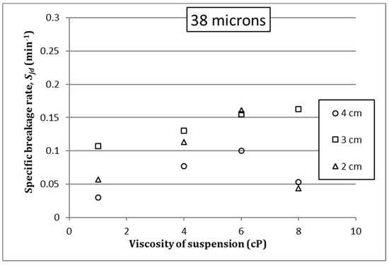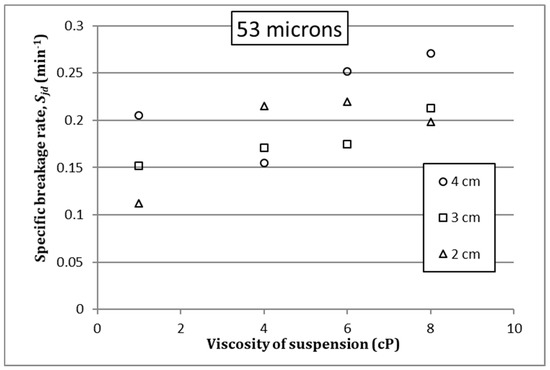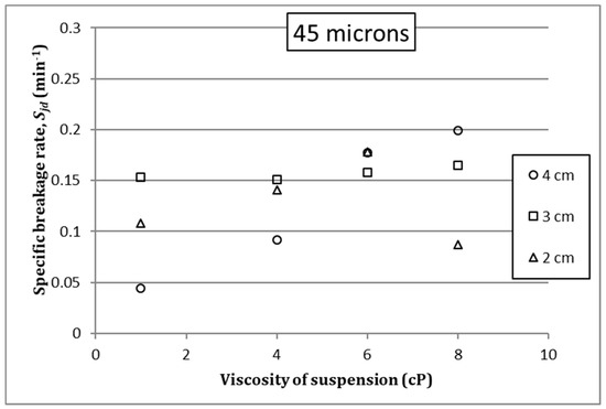 The influence of fluid viscosity on specific breakage rate has been studied under different test conditions. In general terms, specific breakage rate can be modified when increasing the suspension viscosity, within certain ranges. For the test conditions, that relationship could be established using the dimensional analysis by means of Pi-Buckingham’s theorem for different grinding conditions. Results suggest that there is a reduced viscosity range for which the relationship between the specific fracture rates can be considered linear. Furthermore, it can be stated that under any grinding conditions a fluid viscosity that maximizes the breakage kinetics can be defined, and this can be an interesting strategy to optimize the grinding process from the point of view of power efficiency. Nevertheless, further research is needed to get a better understanding of the process and to set a reliable conceptual background in the development of that optimization strategy.