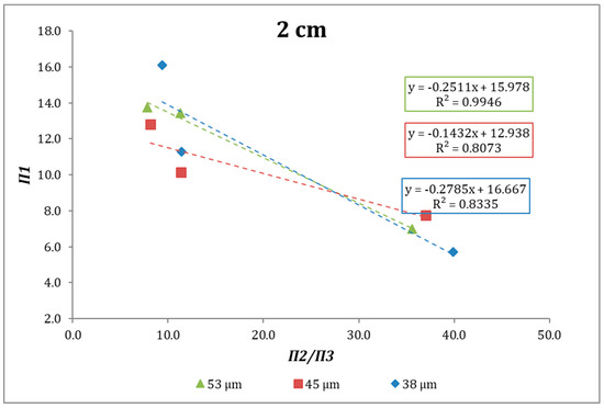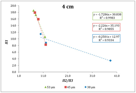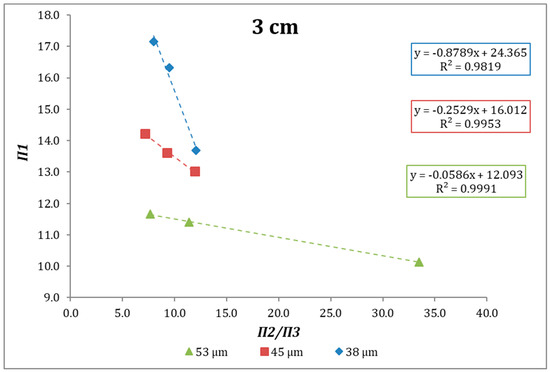 According to the expressions above, when plotting Π1 versus Π2/Π3 (see Figure 8) we can analyze the behavior the specific grinding rate at different specific gravities as a function of μr. Figure 8, Figure 9 and Figure 10 show the behavior of the abovementioned relationship for the systems studied. In all cases, an increase of μr poses a decrease in Π1, that is, an increase in Sjd. In most of the cases the linearity obtained can be satisfactory, although in the case of 2 cm diameter balls, the R2 values are lower in the case of the monosizes 45 and 38 microns.