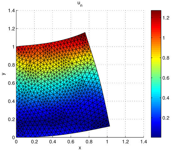 As a first two-dimensional example, we consider the square domain , which is assumed to be clamped on its left part . We also suppose that the thermal displacement and porosity vanish on the whole boundary, and we use the following expression for the mechanical surface force: