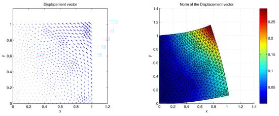 Example 2: Representation of the displacement with arrows (left) and its norm (right) at final time.