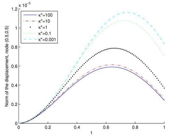 Taking the time discretization parameter , the evolution in time of the norm of the displacement at middle point is shown in Figure 6. It seems that an increasing quadratic behavior is found. Moreover, in Figure 7 we plot the evolution in time of the porosity (left) and the thermal displacement (right). The porosity has an oscillating behavior and, as expected, the thermal displacement has a quadratic form, converging both variables to zero.