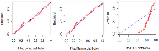 In this section, a real data set is analyzed for illustrative purposes. We consider the data set obtained from a meteorological study in Reference [26] and analyzed by Reference [27]. The data were based on the radar-evaluated rainfall from 52 cumulus clouds (26 seeded clouds and 26 control clouds), namely the sample size n is 52. We apply the Akaike information criterion (AIC), defined by , Bayesian information criterion (BIC), defined by , where p is the number of parameters, n is the number of observations, and L is the maximized value of the likelihood function and Kolmogorov-Smirnov (K-S) statistics with its p-value. The competing model is gamma distribution and generalized inverted exponential distribution. If the Lomax model fits well with the data, it will have low AIC, BIC, K-S statistics value and high p value. Plus, we also draw quantile-quantile plots to test the goodness of the model. The results are presented in Table 3 and Figure 1.