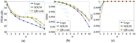 Imperceptibility means that the watermark embedded into the image cannot be perceived by the human eyes, that is, the embedded watermark cannot affect the visual quality of the image. The embedding strength of the watermark plays an important role in the performance of a watermarking algorithm. The selection of it must take the imperceptibility and robustness of the watermark into account. Here, taking “Lena” as the host image, the changes of PSNR, SSIM, and NCC with the embedding strength are shown in Figure 5.