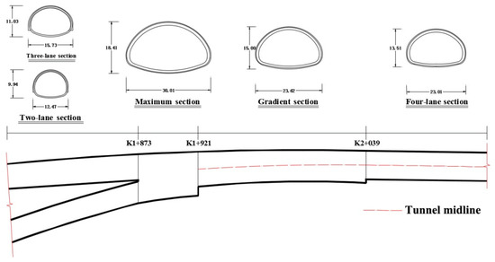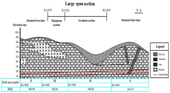 The Liantang Tunnel is an interchange tunnel that passes through carboniferous stratified metamorphic sandstone and Jurassic rhyolite, whereas the surrounding rock is Grades II–V. The large-span bifurcation section of the Liantang Tunnel is located at the intersection of the main line section and the municipal section at the entrance of the Liantang Tunnel. The buried depth is 59–70 m, whereas the maximum profile is 27.45 × 16 m (width × height). Furthermore, the excavation section is 30 × 18.4 m (width × height), and the excavation volume is 428.5 m3/m, which is the largest section highway tunnel in the world so far. How to determine the load and surrounding rock pressure of the Liantang Tunnel is a major technical problem to be solved in the design of the supporting parameters for extra-large-section tunnels. The section size map of the Liantang Tunnel’s large-span bifurcation section and the geological section of the tunnel are shown in Figure 2 and Figure 3, respectively. All sections are symmetrical.