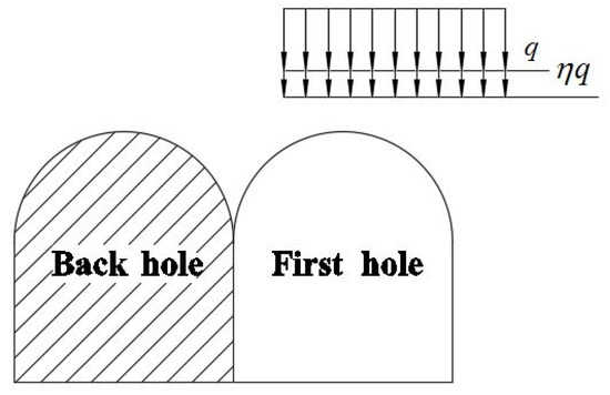According to Protodyakonov’s theory, the excavation of each pilot tunnel should produce vertical uniform load . The influence coefficient is then introduced, and the vertical uniform load of each pilot tunnel is calculated using Equation (13):