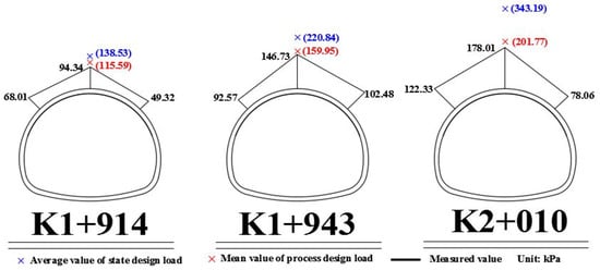The measured surrounding rock pressure of the Liantang Tunnel was compared with the calculated values of the state design load and the process design load, as presented in Table 13. According to the comparison results, the calculated value of the surrounding rock pressure based on the process design method was closer to the measured value and had a certain safety factor, which proves the rationality and feasibility of the process load calculation method.