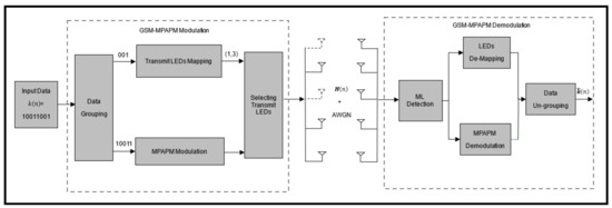 Firstly, theoretical and mathematical models for the VLC system were set up, which were mainly related to the information theory of communication. Secondly, the experiment was carried out with the help of computers and the embedded hardware that was designed for this purpose. This paper is organized, as follows. Section 2 presents related knowledge and the theory regarding MPAPM and GSM. Section 3 describes a typical VLC system and introduces the proposed modulation. Section 4 details the scheme implementation. Analysis of the experimental results is found in Section 5. Finally, the conclusions of this paper are summarized in Section 6.