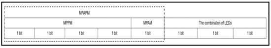 The MPAPM is a compound modulation and it combines two basic modulations that are commonly employed in a VLC system, namely, MPPM and MPAM. For MPPM, the L continuous signals of the binary are modulated in a time period consisting of Q time-slots and optical pulses that appear in P time slots. Moreover, the P optical pulses are arranged according to a certain regularity, so it is generally recorded as (Q,P)MPPM. The relationship of Q, P, and L are expressed in Equation (1), where means the gain of MPPM [14].