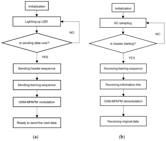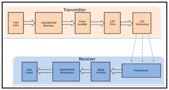 An embedded hardware system was designed in order to test the performance of the proposed GSM-MPAPM in indoor VLC system. The overall system architecture includes two parts, the transmitter and the receiver. The optical signals of the information bits are conveyed in the free space. Figure 4 shows the overall VLC system architecture in detail.
