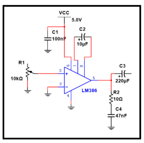 A power amplifier is set as the primary amplification before the driver circuit to improve the drive capability of the transmitter to the wicks since the power of the white LED wicks used in the system is 2 W. The corresponding circuit is shown in Figure 5. In the power amplifier, the LM386 is chosen as an amplifier due to its low power consumption and weak harmonic distortion. By adding an external capacitor between pin 1 and pin 8, the voltage gain can be adjusted to any value up to 200. The power consumption of the LM386 at a static state is only 24 mW at the supply voltage of 5 V.