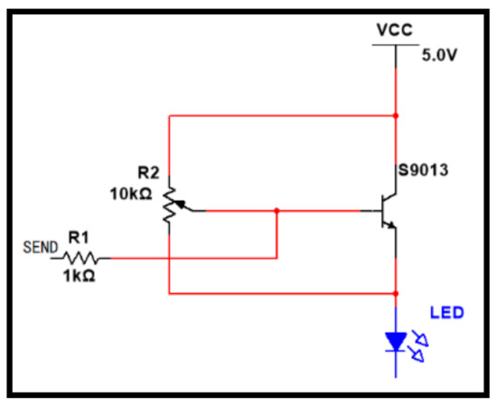 The triode S9013 is employed to form a common-shot amplification and drive circuit in the single LED driver circuit, which is shown as Figure 6. The output signals from the power amplifier are inputted into the circuit through the SEND pin. When there is high input, the S9013 is turned on and the corresponding LED is activated to light up. When there is low input, there is no current flowing through the S9013 and the LED is off.