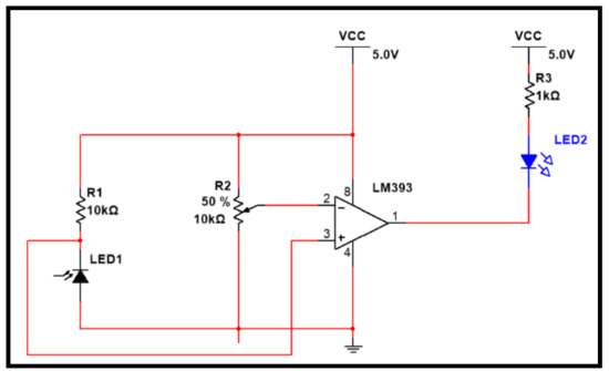 The receiver circuit mainly consists of three parts, i.e., the photodetector, the amplifier, and the GSM-MPAPM demodulator. Figure 7 shows that the resistance value of the photodiode LED1 decreases if it detects optical signals, which thereby forces the positive input voltage of the dual voltage comparator LM393 to decrease; the inverted input voltage is determined by the variable resistance . Therefore, when the photosensitive detector detects obvious optical signals, the voltage of the positive input is less than that of the inverted input, the output of LM393 is low, and LED2 is on. If the photosensitive detector does not detect obvious optical signals, then the voltage of pin 3 is more than that of pin 2, the output is high, and LED2 is off. The sensitivity of the whole photodetector system can be changed by adjusting the value of , according to indoor light interference.