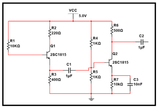 The amplitude of the photodetector’s output signals cannot be satisfied with the demodulation threshold; therefore, the signals must be amplified. In Figure 8, The high frequency triode 2SC1815 is introduced to form a secondary amplifier circuit, which is not only cost-effective, but it also obtains better gain than the operational amplifier.