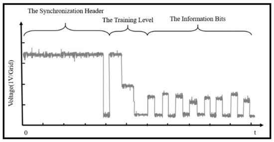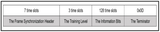 Figure 9 shows the frame format of the information bits, which consists of four parts: The synchronization header of the frame, the training level, the information bits, and the terminator. The synchronization header of the frame uses a high level of six time slots and a low level of one time slot. To eliminate the effects of ambient light, the training levels are added before the information bits. Finally, the signal 0 × 0D is used to represent the end of a frame.