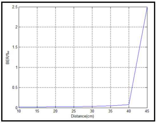 This experiment firstly analyzed two activated LEDs which transmitted eight information bits at a time in the system. The different peak values of the voltage were obtained by changing the distance between the photodetector and the LEDs. The photodetector faced LED1, but all LEDs were at the same level and each was a different distance from the photodetector. Therefore, the different values were obtained according to LED combinations. In Figure 11, Figure 12, Figure 13 and Figure 14 seven high-level synchronization headers were followed by three training levels. The measured peak value of the voltage decreased from 4.15 V, 2.30 V, 1.40 V, to 0.8 V when the distance between the photodetector and the LEDs increased from 10 cm, 20 cm, 30 cm, to 40 cm. It could be seen clearly that in Figure 14, when the distance between the photodetector and the LEDs was 40 cm, the measured peak value of the voltage was almost close to that of the noise. The received signals were drowned in the noise at this moment. The BER performance was also analyzed in this experiment. Figure 15 shows that the BER remained below the value of 1.510−4 when the distance was within 40 cm. However, when the distance exceeded 40 cm, the value rapidly increased. The results of the peak value of the voltage and the BER performance of the received signals both demonstrated that the distance between the photodetector and the LEDs was a very crucial parameter for the proposed scheme in the indoor short-distance VLC. This was mainly due to the use of a single photodetector for the intensity modulation/direct detection demodulation at the receiver. The illumination intensity decreased as the distance increased. Once the distance exceeded a threshold that guaranteed normal communication, multiple levels of interference appeared in the received signals. From the five figures above, it was drawn that the threshold of the distance was 40 cm. Ultimately, the aliasing signals prevented the original signals from being modulated. Furthermore, the luminous power of 1.5 W in this experiment might have been a factor that influenced the BER performance.