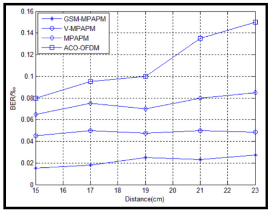 When the string of the information bits with the value of 10100101110000110011110011100110 was transmitted by Tera_Term at the transmitter, the receiver correctly received the string. In this test, the BER performances of GSM-MPAPM, V-MPAPM, MPAPM, and ACO-OFDM were compared. Among them, the latter three were mentioned in [5,9,11], respectively. Figure 16 shows that, within the range of the observation distance that was set between 15 cm and 23 cm, as the distance increased, the proposed (16,1,2)GSM-MPAPM, V-MPAPM, and MPAPM all had a stable performance in the BER, while the BER of ACO-OFDM gradually raised. This was because when the OFDM was applied to the VLC, due to the nonlinear response of the LED, it caused a higher BER than the single carrier modulation, such as GSM-MPAPM, V-MPAPM, and MPAPM, which were compared in Figure 16. At the same time, the (16,1,2)GSM-MPAPM had a better BER performance as compared to V-MPAPM and MPAPM obviously. That is because, as the distance increased, the channel fading was getting more and more serious, the (16,1,2)MPAPM provided an increase in spatial diversity via the two activated LEDs, which causes an improvement in the BER.