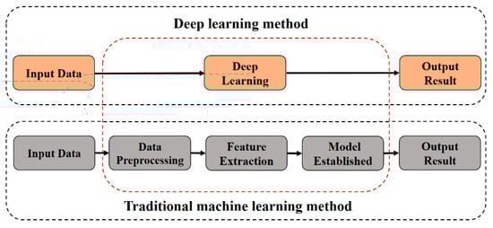DL was first introduced into machine learning (ML) in 1986 and then used in an artificial neural network (ANN) [] in 2000. DL uses multi-level non-linear information to process low-level features to form more abstract high-level representations for supervised or unsupervised feature learning, representation, classification, and pattern recognition []. The DL model is an “end-to-end learning” model, which does not require complex data pre-processing of the original data, making the construction of the model more concise (Figure 1). At present, the DL method has emerged in the industrial field. DL models represented by a CNN have been gradually applied to the study of tool wear condition monitoring and achieved specific results [,,]. For example, Zhang Cunji et al. proposed transforming the vibration signal of a tool in the process of machining into an energy spectrum by a wavelet packet transform (WPT) and inputting the spectrum into a CNN to extract the features automatically and classify them accurately []. German Terrazas et al. proposed that based on the gramian angular summation fields (GASF) module, a large number of continuous force signals generated by cutting tools in a high-speed milling process can be automatically converted into two-dimensional images, which are input into a CNN to obtain the tool wear status []. Cao Dali et al. proposed the construction of a DenseNet using the dense connection, which adaptively extracts hidden high-dimensional features from original time series signals. The results showed that deepening the network layers is helpful for improving the accuracy of the tool wear monitoring model []. The above methods adopt DL to extract features adaptively, which basically solves the shortcoming of a manual extraction of the signal features. However, the convolution neural network (CNN) used relies too heavily on high-dimensional feature extraction. The excessive number of convolutional layers is prone to gradient dispersion, and the number of convolutional layers is too small to grasp the global features and does not take into account the critical feature of the correlation between the timing signal samples generated during tool processing.
