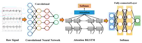 The CABLSTM model mainly includes four parts: The first part involves the local feature extraction of the single time step timing signal, which mainly uses a one-dimensional CNN for neighborhood filtering, uses a sliding window for the convolution calculation, and finally obtains the high-dimensional features of the single time step timing signal. The second part involves the extraction of the time series of time-series signals, and the BiLSTM network is used to process the high-dimensional features generated by the continuous time step timing signals and gradually synthesize the vector feature representation of the input signals. The third part uses the attention mechanism to calculate the importance distribution of sequential signal features in continuous time steps and generate the feature model of sequential signals with an attention probability distribution. The fourth part is the classifier, which uses dropout technology to prevent overfitting and uses the Softmax classifier to predict the tool wear states. The neural network framework for real-time monitoring of the tool wear state based on CABLSTM is shown in Figure 2.