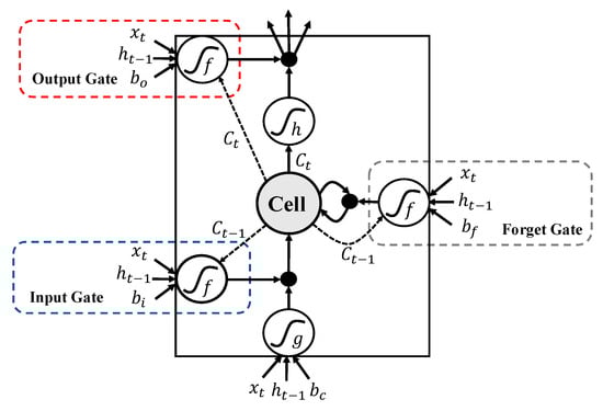 The constructed BiLSTM network contained 256 neurons in this paper. The forward and reverse LSTM networks consisted of 128 neurons. Each BiLSTM neuron included an input gate, a forget gate and an output gate, which are represented by , , and , respectively. The internal structure of the BiLSTM neurons is shown in Figure 4.