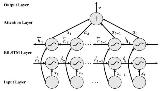 Long short-term memory (LSTM) is an exclusive self-connected recurrent neural network (RNN). LSTM introduces a gate function to generate the path of continuous gradient flow for a long time, which effectively avoids the problem of gradient disappearance and gradient explosion caused by the chain rule in the gradient calculation of hidden layers in RNN []. LSTM can mine the temporal variation law of relatively long intervals in time series, and it is particularly used to process time-series data. The original signal generated during tool processing has a timing relationship. The LSTM network can encode the time series of time-series signals and mine the timing variation in relatively long intervals in the time series []. To ensure that the real-time monitoring model of tool wear can better learn the dependence of time-series features between time-series signals and improve the accuracy of the model classification, this paper improves the existing LSTM network [] and builds a BiLSTM network with a symmetric structure by constructing two directions of LSTM networks []. At the same time, the attention mechanism is introduced into the BiLSTM network to increase the attention layer, which enables the model to both extract temporal signal features from both the positive and negative directions and selectively learn the critical information of the signal features.