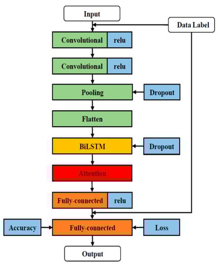 In this paper, the attention mechanism was used to assign weights to each time step output vector of the BiLSTM layer by assigning different initialization probability weights. Finally, the values were calculated by the sigmoid function. The attention mechanism achieves selective filtering and focusing of some critical information from a large number of signal features. The focusing process was embodied in the calculation of the weight coefficients. Different weights were allocated to different critical pieces of information, and the proportion of critical information was enhanced by lifting the weights to reduce the loss of critical information of long sequence timing signals. The calculation formula for the attention mechanism [] is as follows: