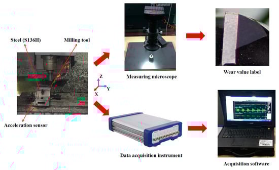 In the experiment, three accelerometers (Model: INV9822; Range: ±50 g) were magnetically attracted to the machine tool fixture in the , , and directions for real-time acquisition of the original vibration signals generated during tool machining. A high-precision digital acquisition instrument (model: INV3018CT) from the Beijing Oriental Institute of Vibration and Noise was used to process the real-time signals and transmit them to a computer. The sampling frequency of the signal was 20 kHz, 200 mm of milling in each direction of the tool was recorded as a milling stroke, and each tool was milled for 330 strokes. After each milling stroke, the milling cutter was removed from the milling machine and photographed. A pre-calibrated high-precision digital microscope (EVDM-101) was used for the measurement, the optical magnification was 0.7×–4.5×, the electronic magnification was 35×–235×, and the measuring accuracy was 0.1 μm. During the measurement process, the position of the wear zone of the minor flank surface of the milling cutter, which was the most easily worn, was selected as the measurement position, and the same reference line was taken as the standard to ensure that the position remains unchanged during the measurement. The wear value (VBmax) was calculated by subtracting the current cutting edge length from the initial length of the cutting edge of the milling cutter. The real-time monitoring experimental device of the tool wear state is shown in Figure 7.