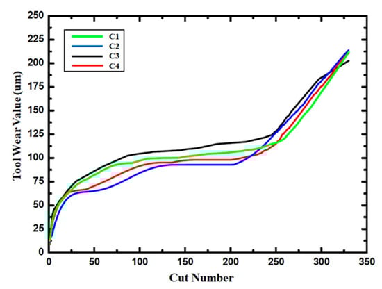 The processing conditions in the experiment had the following characteristics: 1. Finishing milling and small back engagement were performed; 2. the workpiece was milled steel (S136) with high hardness after heat treatment; and 3. the experiment needed to produce tool data set quickly and accurately. This paper referred to references [,,] and the measurement methods of milling tool wear in 2010 prognostics and health management (PHM) competition. The following method was used as the blunt standard for the milling cutter in this experiment: The maximum value (VBmax) of the wear zone of the minor flank surface of the milling cutter was selected as the quantified value reflecting the wear state. It was specified that failure of the milling cutter occurred when the wear value of the milling cutter was greater than 0.13 mm. The wear process of the milling cutters (C1, C2, C3, and C4) is shown in Figure 8.