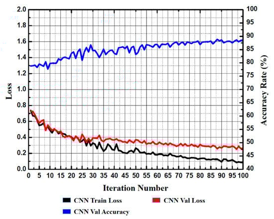 After the training and verification of the DL neural network, different loss function values and accuracies were obtained. The loss function values of the CNN [], BiLSTM [], CLSTM, CBLSTM, and CABLSTM models and the accuracy of the verification set are shown in Figure 9, Figure 10, Figure 11, Figure 12 and Figure 13, where the axis was used to represent the number of iterations of the milling data set, and the double axis was used to represent the loss function value and the model verification accuracy.