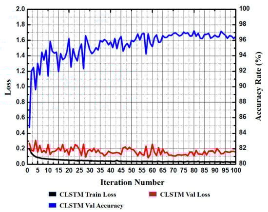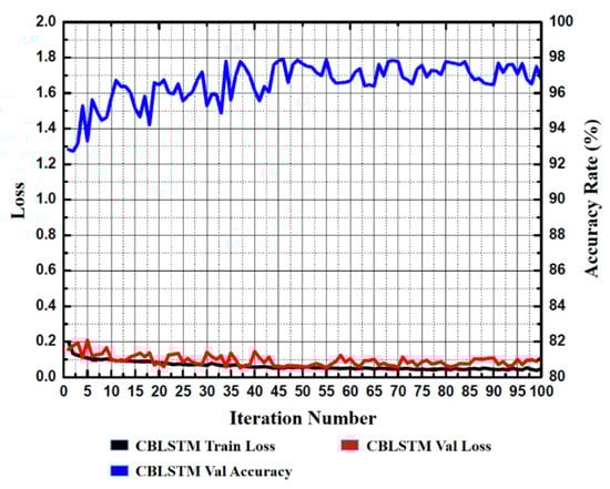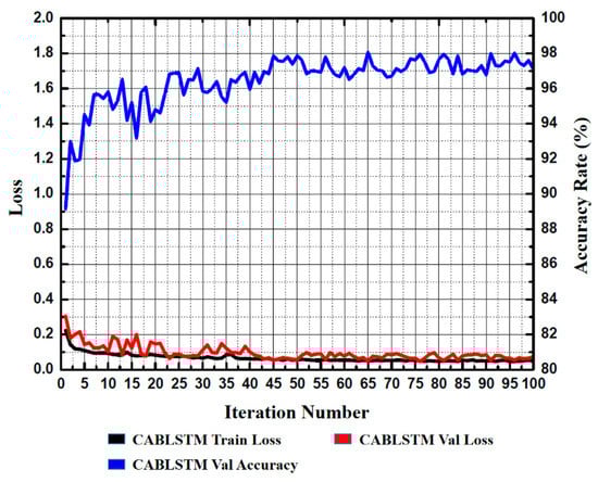 In the network model proposed in this paper, the CABLSTM model had the best performance, which ewas superior to that of the CLSTM and CBLSTM models, and achieved high prediction accuracy. The initial prediction accuracy of the CLSTM model was relatively low. After 65 iterations, the accuracy of the verification set was basically stable and above 96%, and the accuracy was 96.42% after 100 iterations. The CBLSTM model used a two-way LSTM network to access past and future information; that is, it could extract timing signal features from both the forward and reverse directions and extract more abundant information features. After 42 iterations, the accuracy rate of the verification set was basically stable at over 96%, and the accuracy rate was 97.04% after 100 iterations. The CABLSTM model introduced the attention mechanism on the basis of CBLSTM, which selectively filtered out some key information from a large amount of information and focused on the key information, reducing the loss of key information features of long sequence texts. After 35 iterations, the accuracy of the verification set was basically stable and above 96%, the accuracy was 97.50% after 100 iterations, the loss function value reached 0.0651, and the network stability was higher. The loss function and the accuracy of the verification set and test set are shown in Table 5.