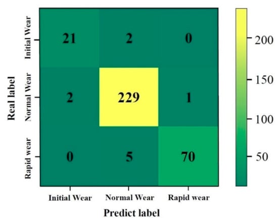 It can be concluded from the figure that the CABLSTM model proposed in this paper completed the inspection of the milling cutter (C4) with an accuracy of 96.97%. The predicted results of normal wear were more accurate. There were some deviations between the initial wear and sharp wear, but the deviations were within a reasonable range. The incorrect prediction results mainly occurred in the transition stage of the wear degree. This is because the tool was in the normal wear state for a long time during the machining process, the amount of data that could be learned by the model was relatively large, and the features were relatively distinct; in addition, the tool had a short period of initial wear and rapid wear, and the amount of data that could be obtained was insufficient. The confusion matrix of the wear test results of the tool test set is shown in Figure 14.