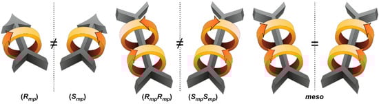 The mirror-image enantiomers of cartoonized mechanically planar chiral [2]rotaxanes with achiral yet directional component parts are illustrated in Figure 2. Employing vocabulary inspired by Prelog [], rotaxanes expressing this type of asymmetry have been described [,,,,,] as “cyclochiral”, or having “cycloenantiomers” and “cyclodiastereomers”. This language can be misleading because cycloenantiomers are macrocycles [], not rotaxanes. After Takata [] described it as a form of planar chirality, Goldup [] proposed the term “mechanically planar” to differentiate this kind of rotaxane-specific chirality from more classical forms of planar chirality. Left-handed and right-handed co-configurations of mechanically planar rotaxanes are written as (Rmp) and (Smp), respectively, where the subscript “mp” denotes mechanically planar. The assignment of absolute co-configuration relies on Cahn–Ingold–Prelog [] rules to define the directionality of each component part.