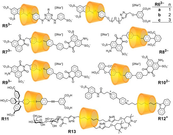 CD cyclodirectionality is attributable to the polarity of the glycosidic bonds linking glucose subunits. This cyclodirectionality means that any CD-based [2]rotaxane capable of orientational isomerism necessarily possesses mechanically planar chirality. A collection of [2]rotaxanes from Anderson [,] (R53−, R11), Zhao [,,] (R546a-c2−), Tian [,,] (R73−, R82−, R93−, R102−), Park [] (R12+), and Mezzina and Lucarini [] (R13) are shown in Figure 3 as examples of [2]rotaxanes that were isolated as pure orientational isomers (and therefore also as single mechanically planar enantiomers).