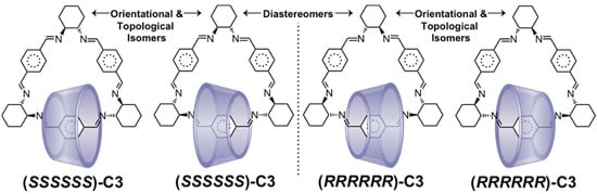 Most examples [,,,,] of CD [2]catenanes do not possess a second cyclodirectional ring. However, Kuhnert and Tang [] have created diastereomeric [2]catenanes (RRRRRR)-C3 and (SSSSSS)-C3 (Figure 4) by [3+3] cyclocondensation of trans-1,2-diaminocyclohexane and terephthalaldehyde in the presence of β-CD to form the hexaimine macrocycle known [] as trianglimine. The corresponding trianglamine catenanes were also obtained and characterized by reduction of the imine bonds. By using pure (RR)- or (SS)-diaminocyclohexane during cyclocondensation, it is possible to capture either the all-R or all-S enantiomer, respectively, of the trianglimine in β-CD. Since β-CD is also a chiral macrocycle, these two catenanes are diastereomers rather than enantiomers. Although the authors did not comment on the presence of orientational isomers or their distribution, the cyclodirectionality of the trianglimines should lead to two possible orientational isomers for each of these catenanes. Since both rings are cyclodirectional, these orientational isomers are also topological isomers.