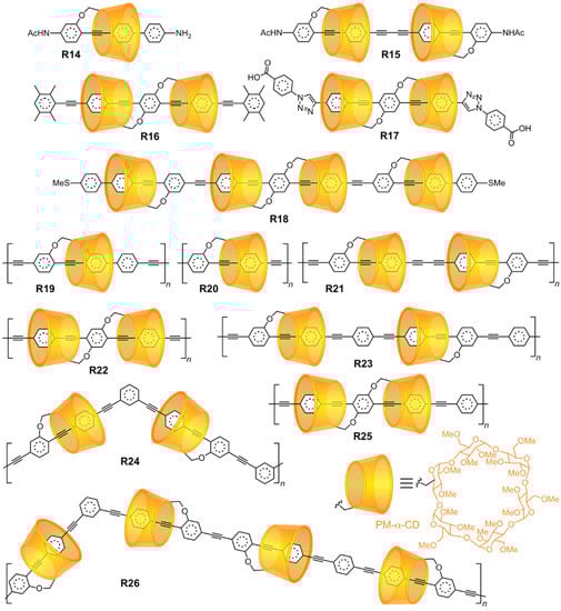 The regioselective mono-functionalization of CDs has facilitated the synthesis of [1]rotaxanes, wherein axles are covalently bonded to the encircling rings. Kaneda [] and Easton [] independently first exploited the regioselective alkylation of α-CD to make [1]rotaxanes in 2003. Tian [] has also prepared a β-CD [1]rotaxane. Terao [,,,,,,,,,,] has developed an extensive family (Figure 5) of oligo- and poly[1]rotaxanes R14-R26 with fully π-conjugated phenylene–ethynylene backbones. Polyrotaxanes possessing π-conjugated (semiconducting) backbones are known [] as insulated molecular wires (IMWs). An advantageous outcome of using CDs to make [1]rotaxane monomers is that their regioselective functionalization leads to the formation of mechanostereochemically pure orientational isomers. Fixing the rings to the backbone allows one to exercise perfect control over the location and orientation of the insulating CD beads that protect the inner molecular wire. Note that all of these compounds also exhibit mechanically planar chirality (see Section 2.2).