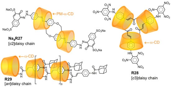 Another group of mechanomolecules enabled by the regioselective functionalization of CD with CD-binding moieties are known [,] as daisy chains (Figure 6), in which two or more self-complementary ring-axle dyads are cross-threaded into cyclic (denoted [cn]daisy chain) or acyclic ([an]daisy chain) structures. Kaneda [] and Harada [] independently and almost simultaneously introduced the first α-CD daisy chains (Na4R27 and R28) as cyclic dimers and trimers, respectively. Harada [] also obtained the [an]daisy chain oligomer R29 from 2-cinnamoyl-α-CD monomers, possessing up to 10 repeating units. A number of other CD-based daisy chains with these architectures have followed these seminal works [,,,,]. Daisy chains are important compounds in the field of molecular machines (see Section 3.3).