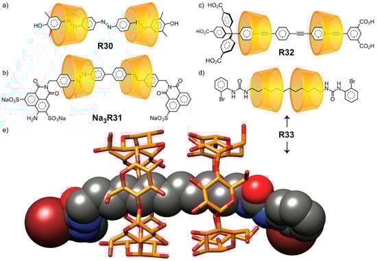 A number of [3]rotaxanes (Figure 7) have also been obtained with high orientational selectivity. Anderson [] achieved the first mechanostereoselective synthesis of the [3]rotaxane R30 as the tail-to-tail orientational isomer. Tian [] has also observed high orientoselectivity in the synthesis of tail-to-tail α-CD [3]rotaxane Na3R31. In contrast, Anderson’s oligophenylene(ethynylene)/α-CD [3]rotaxane was obtained [] solely as the head-to-tail orientational isomer R32 by solid-phase synthesis. Finally, the head-to-head isomer of R33, as reported by the group of Takata, [] has been characterized in the solid state (Figure 7e) by X-ray crystallography.