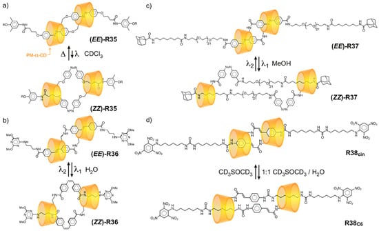 In Kaneda’s daisy chain (EE)-R35 [], the self-complementary monomers comprise permethylated a-CD (PM-a-CD) rings linked directly to trans-azobenzene units. The (EZ)-R35 and (ZZ)-R35 isomers emerge (Figure 8a) in 20% and 5% yields, respectively, upon irradiation at 366 nm, owing to the E→Z photoisomerization of one or two azobenzenes. Easton’s daisy chain (EE)-R36 operates [] analogously (Figure 8b), but the more stable nature of the photoactive stilbene unit allows (EE), (EZ), and (ZZ) isomers to be isolated and characterized as pure compounds. The hydrodynamic radius (RH) in water is shortened from 4.4 nm in Harada’s (EE)-R37 to 3.6 nm in (ZZ)-R37, which is populated (Figure 8c) with up to 85% efficiency in the photostationary state in MeOH []. Harada [] also made a solvent-switchable daisy chain R38 in which the α-CD rings encircle cinnamamide units in CD3SOCD3, but migrate to a peripheral hexamethylene chain upon addition of water, affording a net contraction (Figure 8d) driven by the hydrophobic effect.
