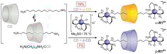 CD-based host–guest complexes are convenient templates for the synthesis of molecules with mechanical bonds [,,,,,], also known [] as mechanomolecules. A mechanical bond is defined [] as “an entanglement in space between two or more molecular entities (component parts) such that they cannot be separated without breaking or distorting chemical bonds between atoms”. The archetypal mechanomolecules are (i) [n]catenanes, in which n ring-shaped component parts are interlocked, and (ii) [n]rotaxanes, in which the n component parts comprise one or more rings encircling one or more acyclic “dumbbells”, which possess endgroups or “stoppers” that prevent the ring(s) from dissociating. Since complexation is driven by a hydrophobic effect, a simple and convenient template for making mechanomolecules is a hydrocarbon⊂CD pseudo-[2]rotaxane (the prefix pseudo- denotes an unstoppered threaded assembly). In general, CDs exhibit increased affinity for oligomethylenes as chain length increases, assuming the guests are water soluble [,]. Indeed, the first successful template-directed synthesis of a [2]rotaxane was carried out by Ogino [] (Scheme 1) using an amine-terminated dodecane (C12) guest with α-CD or β-CD hosts. Ogino used cis-dichlorobis(ethylenediamine)cobalt(III) chloride [CoCl2(en)2]Cl to stopper CD-threaded H2NC12H24NH2 chains in Me2SO at 75 °C, generating either α-R14+ (19% yield) or β-R14+ (7% yield) upon isolation by size-exclusion chromatography. The higher yield for α-R14+ compared to β-R14+ reflects the alkanes’ higher affinity for α-CD. Note that while the cobalt-capped hydrocarbon chain has a high symmetry (D∞h) by itself, the overall symmetry of the corresponding rotaxanes are reduced (Cn) to that of the encircling cyclodextrin, where each end of the dumbbells become differentiated by their proximity to a different rim of the CD ring.