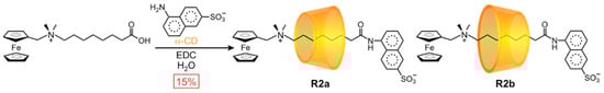 The earliest rotaxanes to exhibit orientational mechanostereoisomerism were based on α-CD. In 1991, Kaifer [,] coupled a carboxylic acid-terminated half-dumbbell with a sulfonated aminonaphthalene stopper in the presence of α-CD to generate (Scheme 2) a mixture of orientational mechanostereoisomers R2a and R2b. In this case, the CD rings had no orientational bias; both isomers were obtained in equal proportion. When the isomers were separated by thin-layer chromatography and isolated as pure compounds, they showed a surprising behavior: the CD ring slowly escaped from the dumbbell in R2a, but not in R2b. This kind of face-selective motion presents a promising opportunity for the design of molecular machine prototypes (see Section 3.2).